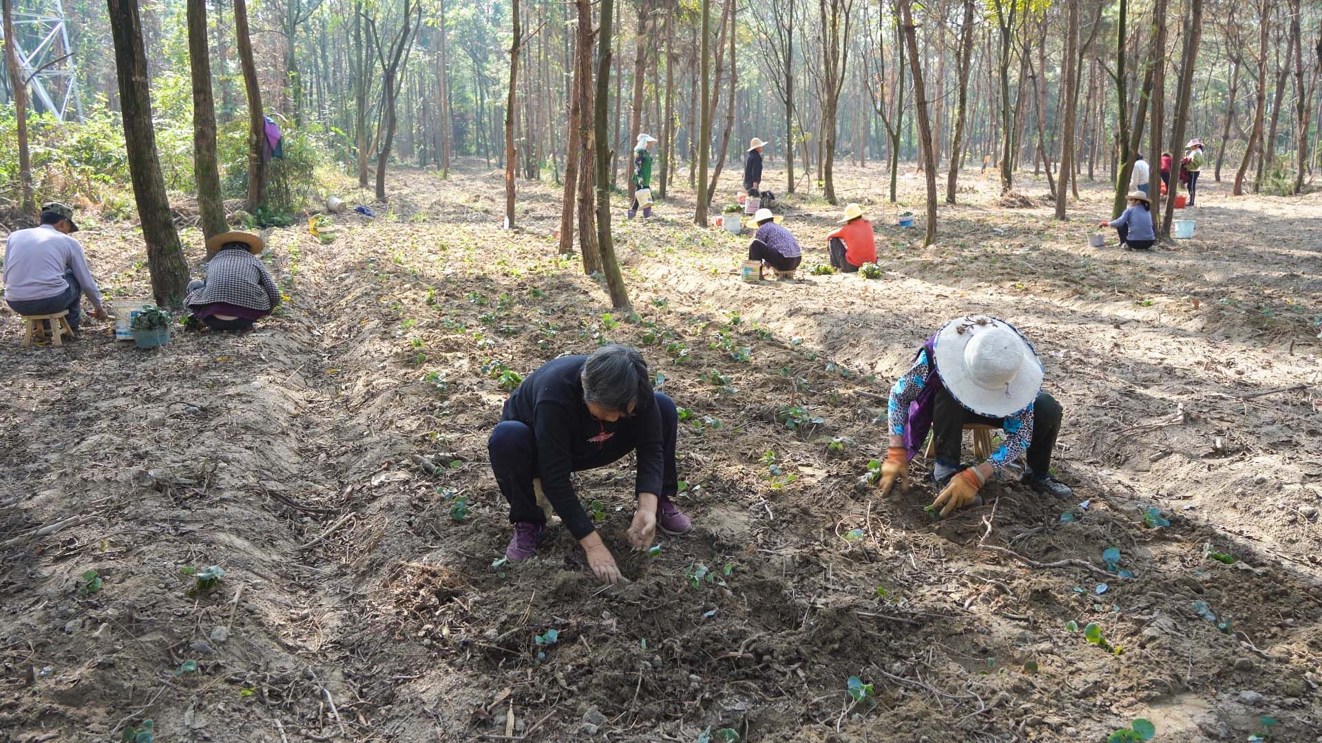 当天上午,记者来到了沙坪镇枫树村淫羊藿种植基地,这里生态环境优美,林地边一条小河蜿蜒而过,一排排高耸的野生树木密集生长。在树林深处,不少村民正手拿铁锹挖坑培土,种下淫羊藿苗,大家动作麻利,聊天说笑之际沙土地上便种满了成片的淫羊藿苗。