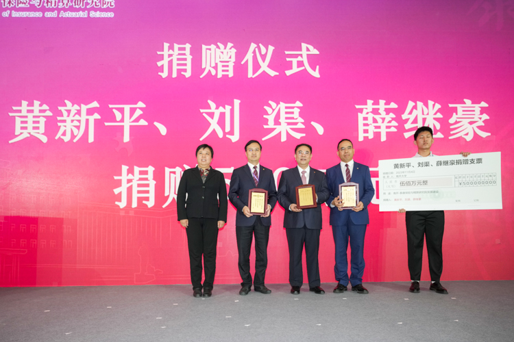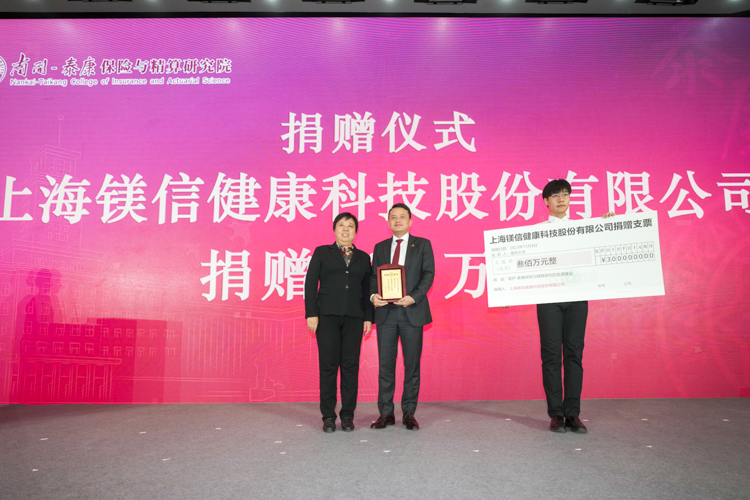 南开-泰康保险与精算研究院自成立以来,各项发展均得到了社会各界及广大校友的热心支持。为助力研究院在学科发展、科学研究、人才培养等方面的工作,业界和校友纷纷捐资支持,共接收捐款800万元,重点用于研究院健康精算科技实验室建设及研究院的科学研究与行业实践等方面。现场举行了捐赠仪式,南开-泰康保险与精算研究院负责人向张小栋和南开大学校友黄新平、刘渠、薛继豪致送捐赠纪念牌。