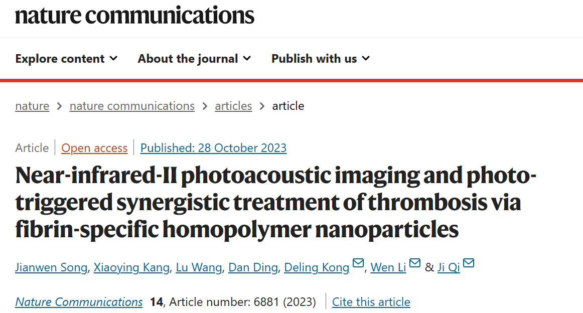 近日,南开大学药物化学生物学全国重点实验室和生命科学学院齐迹、孔德领等在血栓类疾病可视化协同治疗领域取得的最新研究成果以“Near-infrared-II photoacoustic imaging and photo-triggered synergistic treatment of thrombosis via fibrin-specific homopolymer nanoparticles”为题发表在国际著名期刊Nature Communications上。该团队设计开发了一种具有血栓高效靶向能力的新型有机分子探针,实现了活体层面长波长近红外二区光声成像可视化和热涌动与一氧化氮协同治疗血栓。