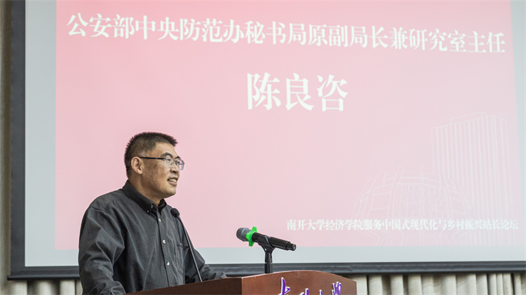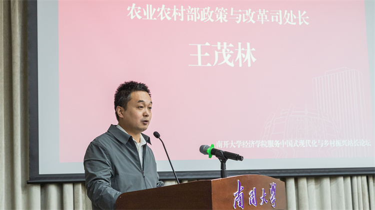 南开大学政治经济学研究中心副主任张海鹏代表乡村工作站校内站长发言,他回忆了之前赴浙江省湖州市安吉县和山东省德州市临邑县的调研经历,对当地政府给予的充分支持表示感谢。张海鹏从增产与增收、融合与融入、合作与联合、引资与引智四个层次分享了对乡村振兴议题的思考,并表示,要用好乡村工作站这一平台,扎实工作,着力推动产业高质量发展,真正为乡村振兴作出贡献。