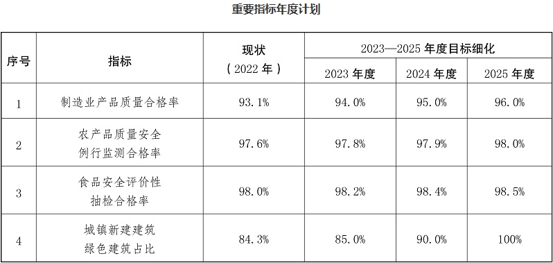 到2025年,新产品、新业态蓬勃发展,产品、工程、服务质量水平显著改善,制造业产品质量合格率提高到96%,农产品质量安全例行监测合格率达到98%以上,食品安全评价性抽检合格率保持在98.5%以上,工程质量抽查符合率不断提高,城镇新建建筑绿色建筑占比达到100%。