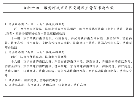 (二)构建沿黄河城市片区交通网主骨架。沿黄河城市片区包括省会经济圈的济南、淄博、东营、泰安、德州、聊城、滨州7市及鲁南经济圈的济宁、菏泽2市。重点以济南为中心,完善济南-德州、济南-滨州(东营)、济南-淄博、济南-莱芜、济南-泰安、济南-聊城6条放射状通道和德州-滨州-淄博-济南(莱芜)-泰安-聊城-德州环形通道,加快构建“环米字形”综合交通运输主骨架。规划以济南为核心的“一环十一射”高速铁路、“两环十六射”高速公路布局,济南与周边市实现“高铁双通道”,高速公路实现“县县连省会”,打造省会半小时交通圈。强化省会经济圈与济宁、菏泽地区交通连接,以济南为引领,推动形成以沿黄高铁、沿黄两岸双高速为骨架的沿黄达海综合运输通道,提升与京津冀、中原城市群省际通道能力,支撑沿黄河城市片区高质量发展,打造黄河流域生态保护和高质量发展引领区、全国区域一体化发展示范区。