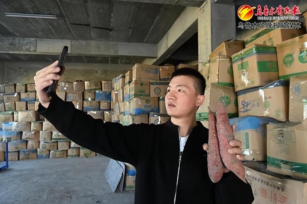 11月9日,在米东区长山子镇土窑子村红薯种植户李嘉龙家冬储红薯仓库,李嘉龙正在手机直播销售红薯。记者陈岩摄
