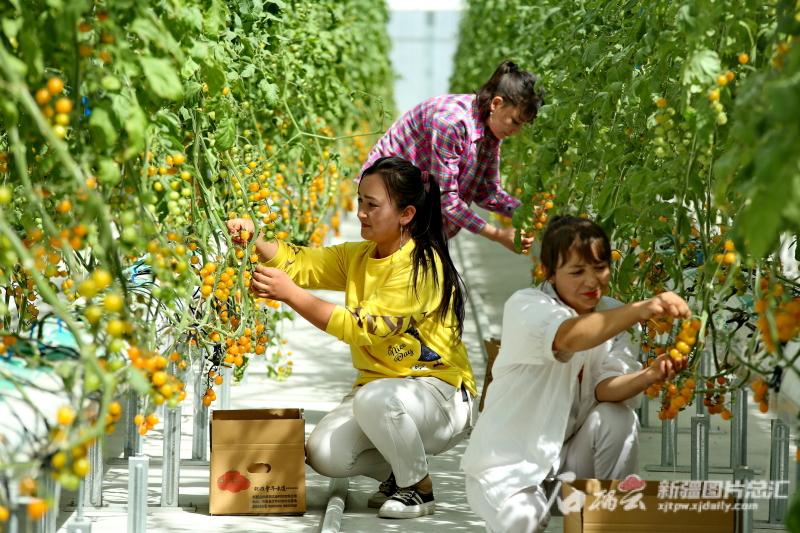 图为新疆盛世华强农业科技有限公司万亩设施农业基地,工人正在采摘圣女果。李玲辉 摄