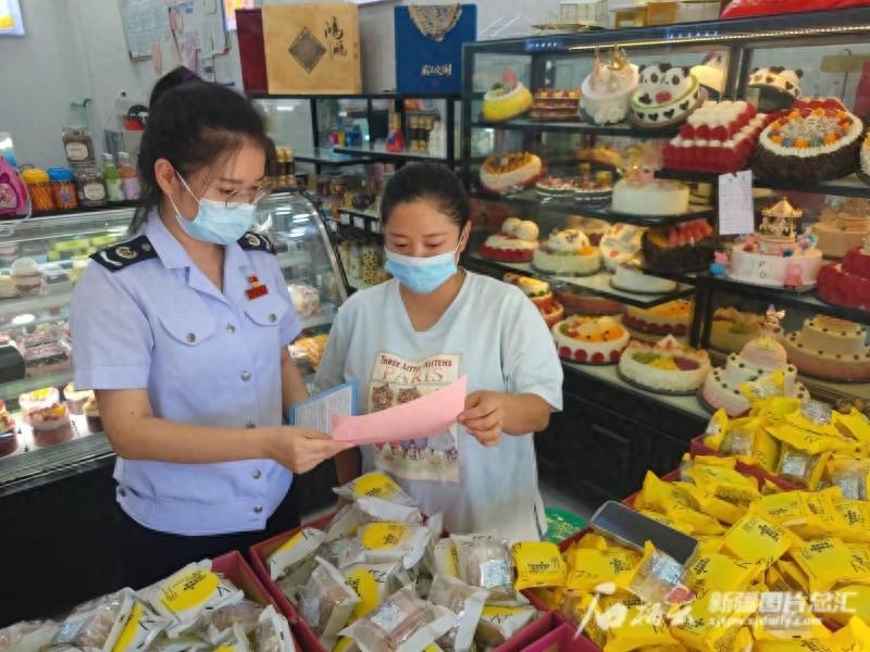 图为尉犁县税务局干部在中秋前夕为月饼生产企业送上助企纾困相关措施。(图片由尉犁县税务局提供)