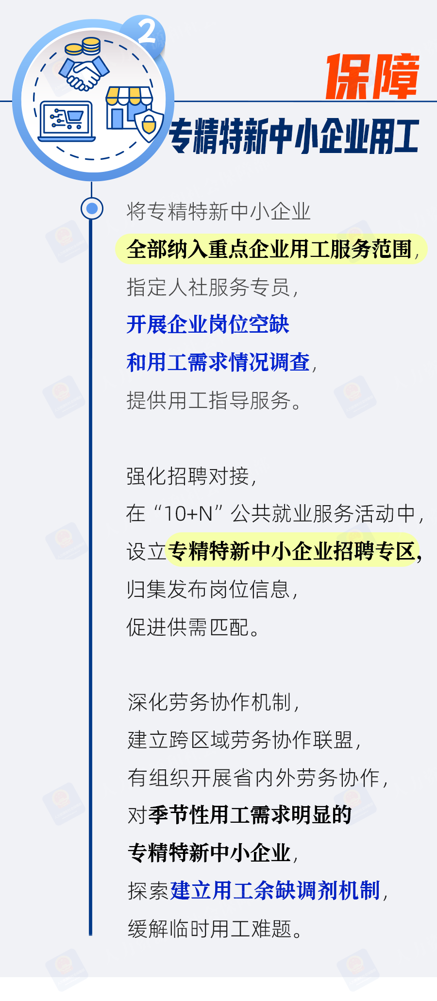 二是保障企业用工。将专精特新中小企业纳入重点企业用工服务范围,在“10+N”公共就业服务活动中设立招聘专区,促进供需匹配。深化劳务协作机制,探索建立用工余缺调剂机制,缓解用工难题。