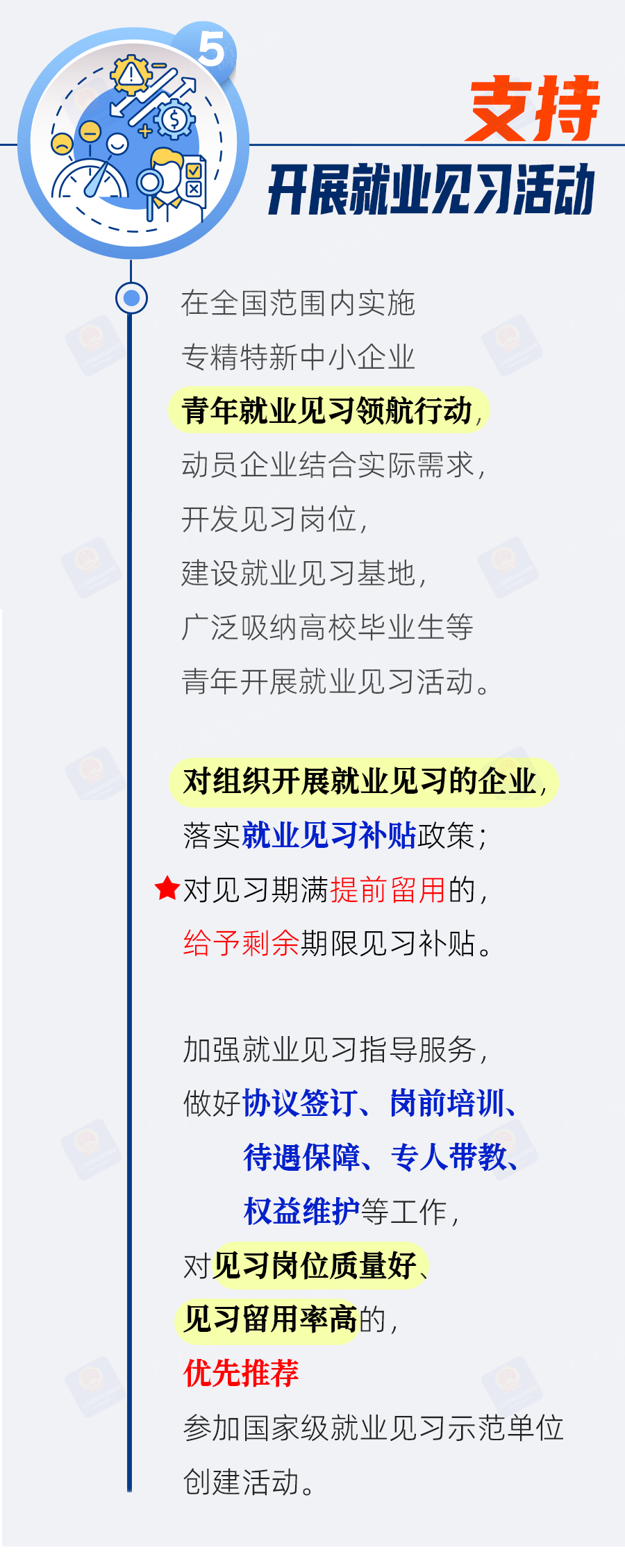 五是支持开展就业见习活动。实施专精特新中小企业青年就业见习领航行动,开发见习岗位,建设就业见习基地,对组织开展就业见习的企业,落实就业见习补贴政策;对见习期满提前留用的,给予剩余期限见习补贴。