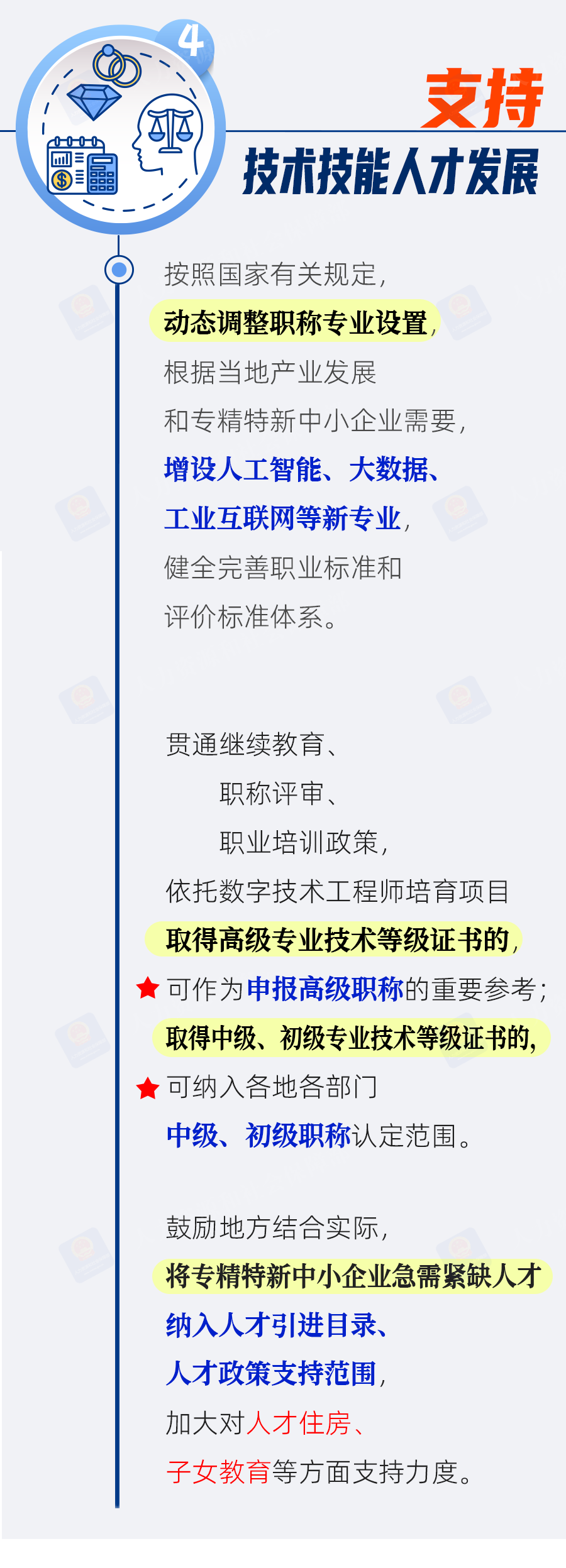 四是支持技术技能人才发展。动态调整职称专业设置,健全完善职业标准和评价标准体系。贯通继续教育、职称评审、职业培训政策,依托数字技术工程师培育项目取得高级专业技术等级证书的,可作为申报高级职称的重要参考;取得中级、初级专业技术等级证书的,可纳入各地各部门中级、初级职称认定范围。