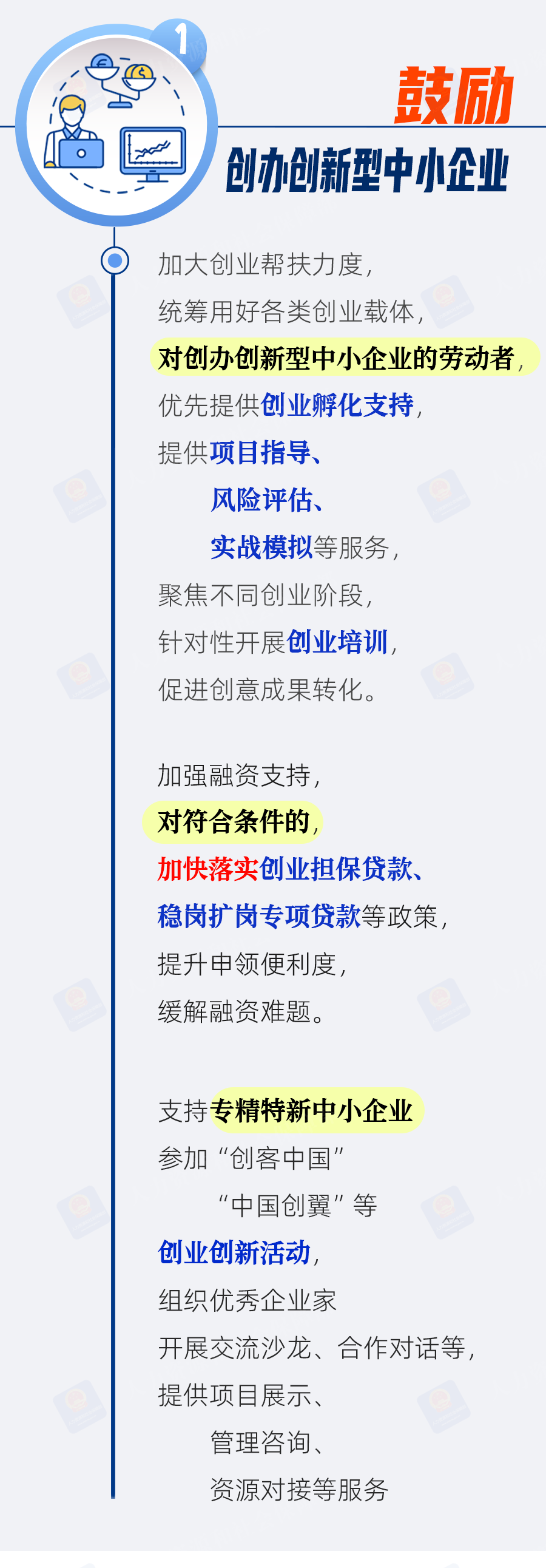 一是鼓励创办创新型中小企业。加大创业帮扶力度,优先提供创业孵化支持,提供项目指导、风险评估、实战模拟等服务。加强融资支持,对符合条件的,加快落实创业担保贷款、稳岗扩岗专项贷款等政策。