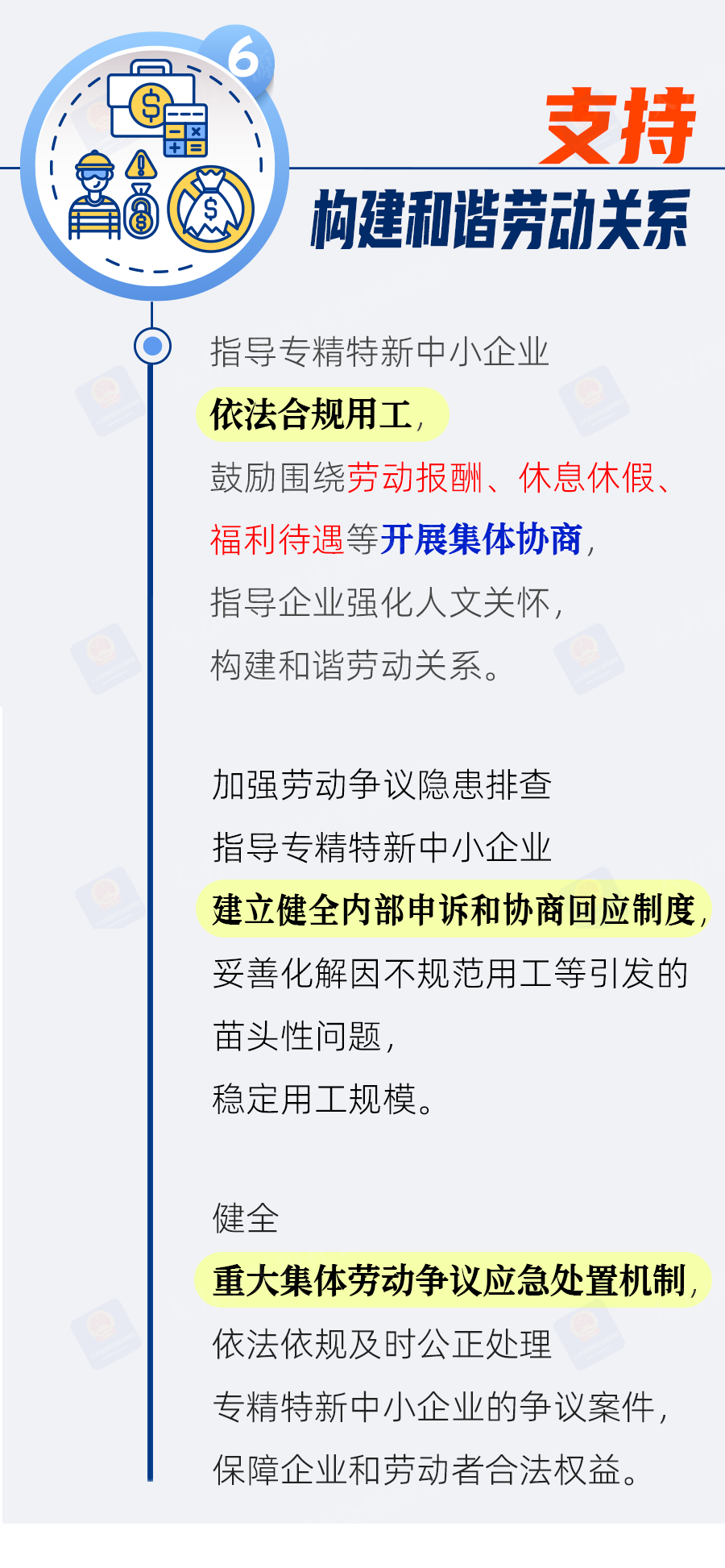 六是支持构建和谐劳动关系。指导企业依法合规用工,鼓励围绕劳动报酬、休息休假、福利待遇等开展集体协商。加强劳动争议隐患排查,健全重大集体劳动争议应急处置机制,保障企业和劳动者合法权益。