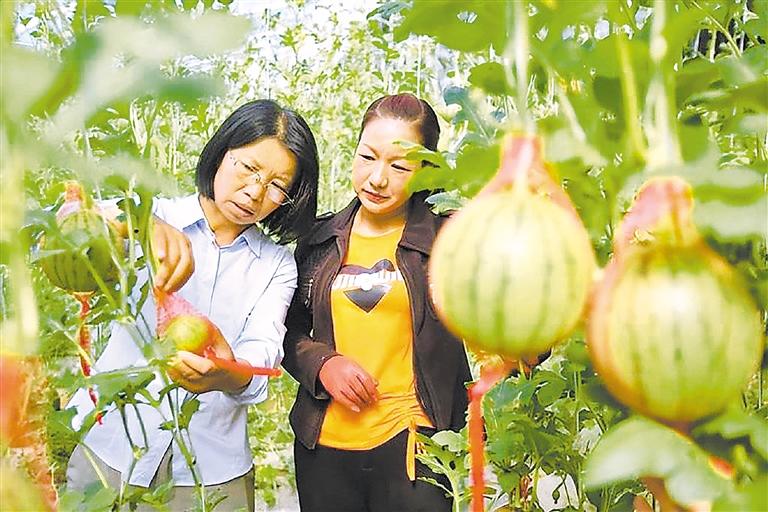 赵金霞(左)检查西瓜生长情况。 (图片由受访者提供)