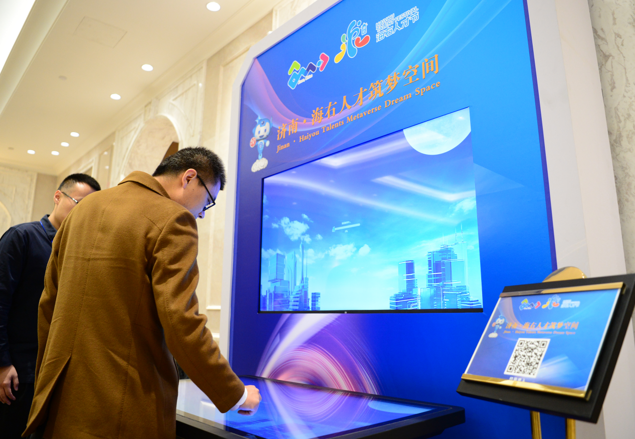 此外,在项目对接会现场,还搭建了“济南·海右人才筑梦空间”。该空间是基于壹点天元先进的元宇宙技术,打造的出全方位、多层次的元宇宙生态空间。参赛选手可沉浸式漫步其中,了解济南市重点园区和平台载体的基本情况、重点产业、扶持政策、重点企业、周边配套以及联系方式等。空间内还分区域集中展示第六届大赛参赛项目,方便区县了解项目,实现区县与人才的双向选择,提升对接效率。