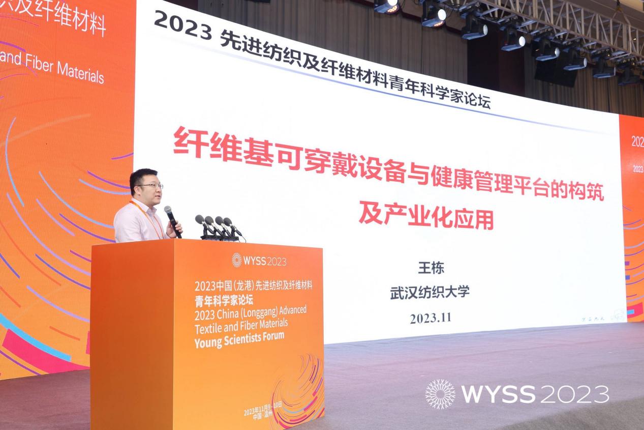 武汉纺织大学校党委常委、研究生院院长、纺织纤维及制品教育部重点实验室主任、博士生导师王栋以“纤维基可穿戴设备与健康管理平台的构筑及产业化应用”为题,对先进纤维材料在智能穿戴设备上的应用及在相关健康管理平台上的产业化进行了生动讲解。