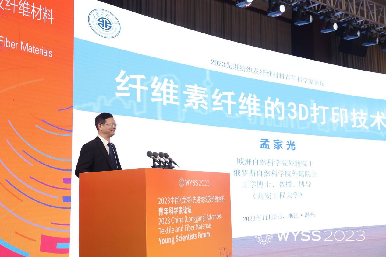 高峰报告会环节西安工程大学教授、俄罗斯自然科学院外籍院士、欧洲自然科学院外籍院士孟家光作了题为“纤维素纤维的3D打印技术研发”的报告,围绕废旧棉织物回收的3D打印技术、改善现有3D打印织物的舒适柔软性和进一步实现更快速的直接3D打印服装等方面进行讲解。
