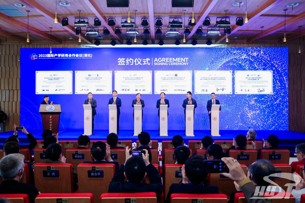 在揭牌及签约环节,华中科技大学党委常委、副校长陈建国、解孝林、武汉大学党委常务副书记沈壮海等湖北省内23所高校和机构相关负责人共同为2个国际科研合作平台揭牌、签署18份合作协议。教育部学校规划建设发展中心党总支副书记易辉明主持揭牌和签约环节。