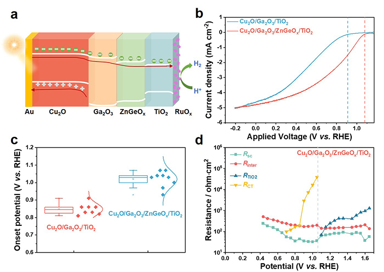 在改善Cu2O光阴极起始电位方面,以往研究多着眼于改善p-n结界面材料能级匹配,忽略了n型界面层之间的能级优化匹配。通过文献调研及阻抗分析,罗景山教授指导博士生程金水和武琳晓发现目前最优结构之一的Cu2O/Ga2O3/TiO2光阴极,在n型界面层Ga2O3和保护层TiO2之间存在不利的界面势垒和电阻,限制了其起始电位和填充因子的提升。基于此,该团队通过原子层沉积技术开发了ZnGeOx新型界面层材料,并将其引入至Ga2O3和TiO2之间构建了双界面层结构,成功将Cu2O光阴极起始电位提升至1.07 V (vs. RHE)的记录值。