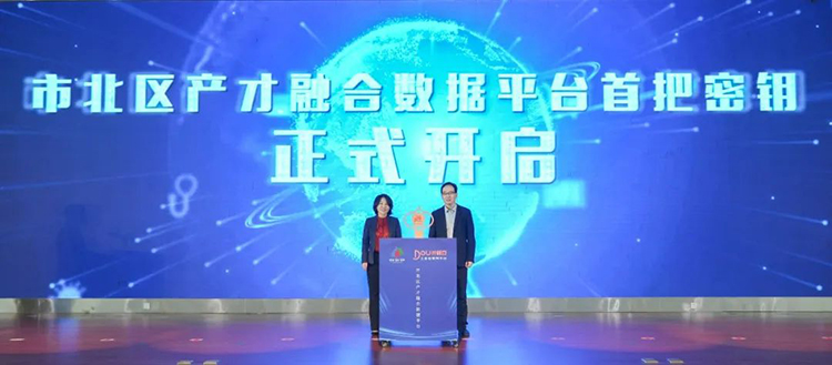在密钥开启环节,由市北区委人才办和省人才集团共同开发的产才融合数据平台企业端首次落地启用,市北区委常委、组织部部长管方圆,檬豆网络科技执行总裁秦军共同举起密钥,启动平台运行,平台可结合企业引才需求精准研判,并靶向定位、链条式规划引才路径,助推企业索才引才。