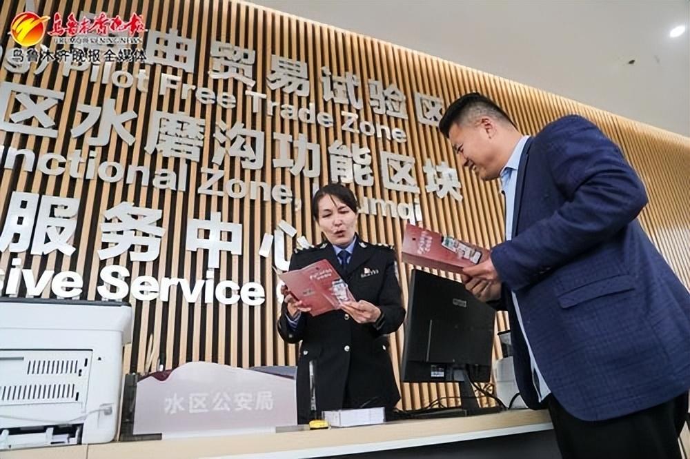 在文化中心规划馆1楼综合服务中心,公安窗口的工作人员在给乌鲁木齐市意浓浓食品有限公司的总经理姜玉哲介绍相关政策。记者米热扎提·木塔力甫摄
