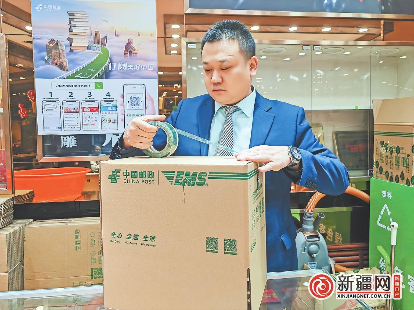 11月13日,在中国邮政集团有限公司乌鲁木齐市分公司扬子江路营业网点,工作人员正在使用45毫米窄胶带进行打包。(全媒体记者王艳红摄)