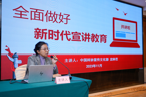 在专家授课环节,沈林芑以《全面做好新时代宣讲教育工作》为题,分别从“坚持不懈筑牢中国式现代化建设的思想根基”“挺膺担当,做培育创新文化的‘开路小工’”“高质量做好新时代思想政治引领工作”三方面阐释了用创新思想凝心铸魂,建好精神家园,增强建设高水平自立自强的信心的重要意义,从给谁讲、讲什么、如何讲等视角介绍了中国科协开展科学家精神宣传弘扬工作的成功做法,并指出新时代发挥科协桥梁纽带作用最根本的是强化思想政治引领,要做好支撑服务、供需对接和组织保障,团结引领广大科技工作者坚定理想信念、坚定创新自信、坚定科技报国,积极投身中国式现代化建设伟大工程。