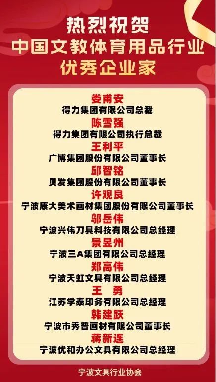 近年来,在我国经济发展面临困难挑战情况下,宁波文具行业企业家带领广大企业从业者,积极应对,主动作为,攻坚克难,开拓进取,为国家稳增长、稳就业、稳物价,特别是推动行业高质量发展做出了重要贡献。再次祝贺以上优秀企业家!