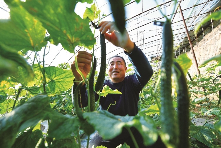 在银川市贺兰县习岗镇新平村农业设施园区,桂天云在自家的温棚里采摘黄瓜。