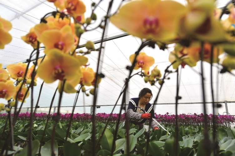 在宁夏宏茂花卉种植基地,工作人员在温棚里打理蝴蝶兰。