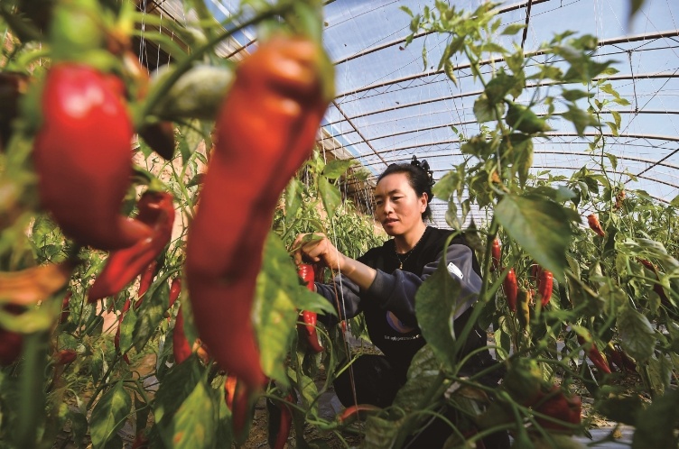 在银川市贺兰县习岗镇新平村农业设施园区,陈荣在温棚里采摘辣椒。