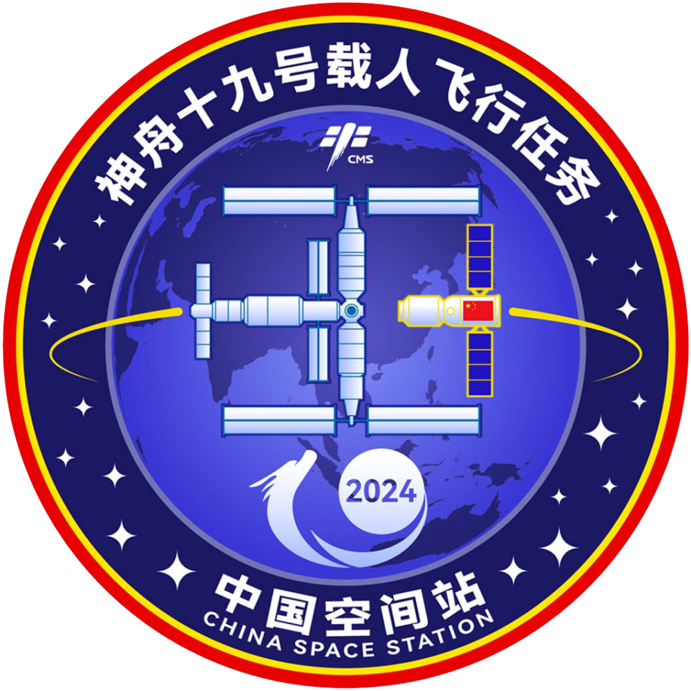 该方案是由中国空间站、神舟载人飞船、地球、星空等图案构成的一个红、黄、蓝配色的圆形标识。数字“19”融入中国龙的元素,舞动上升。周围的点点星辰共十九颗,对应神舟十九号载人飞行任务,共同体现我国航天事业的繁荣昌盛。