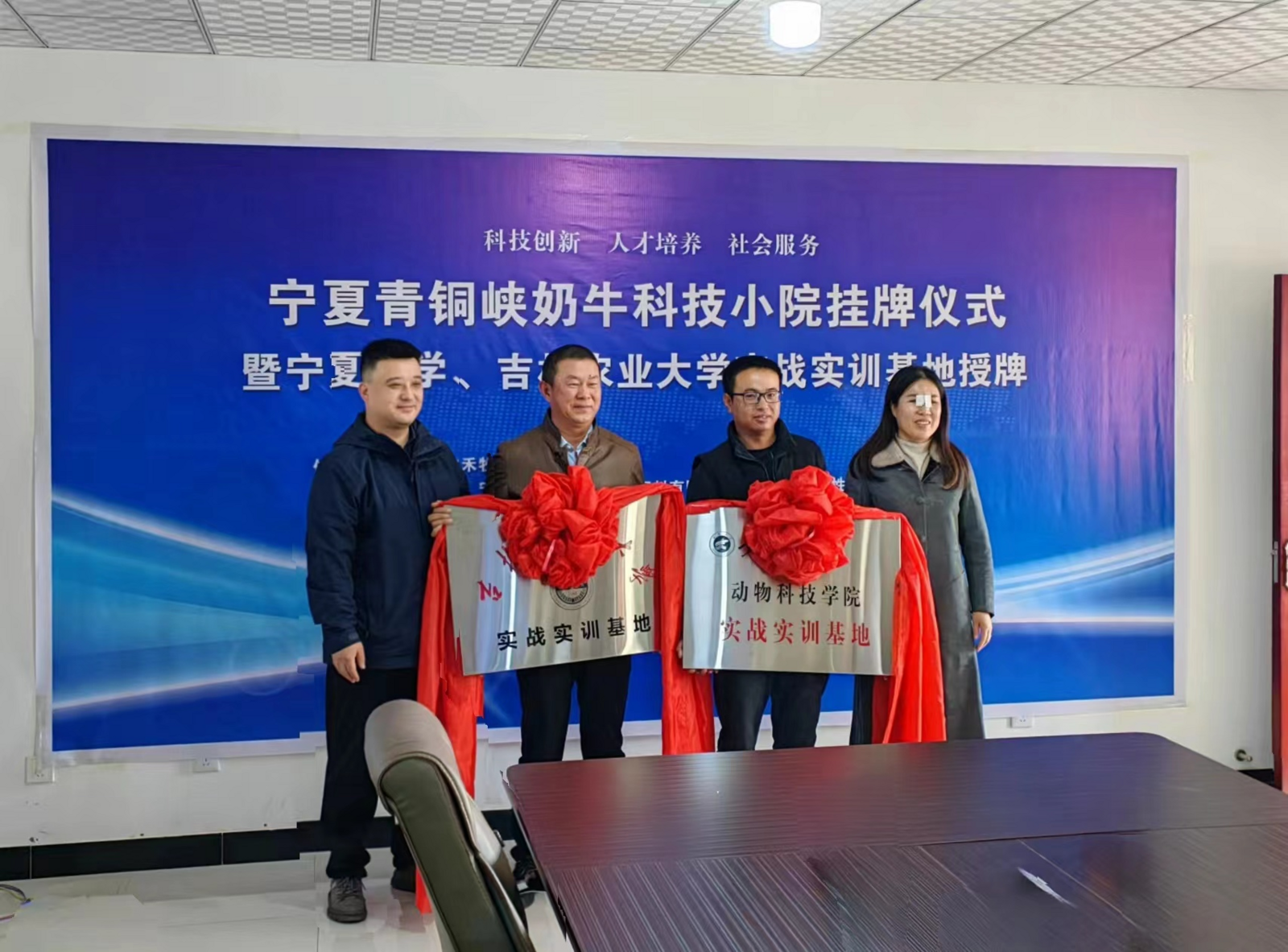 11月13日,在宁夏一加禾牧业有限公司举行的青铜峡奶牛科技小院挂牌仪式上,吉林农业大学、宁夏大学动物科技学院实战实训基地授牌仪式同时举行,标志着该科技小院筑巢引凤、强强联手,在强化科技小院科技力量、推动人才跨省区培养、深化科技小院建设方面迈出了可喜的一步。宁夏科协科普工作队、宁夏农技协和宁夏一加禾牧业有限公司、宁夏博瑞饲料有限公司、宁夏反刍种性研究科技有限公司的相关负责人以及宁夏大学、吉林农业大学的师生等20余人参加了本次活动。
