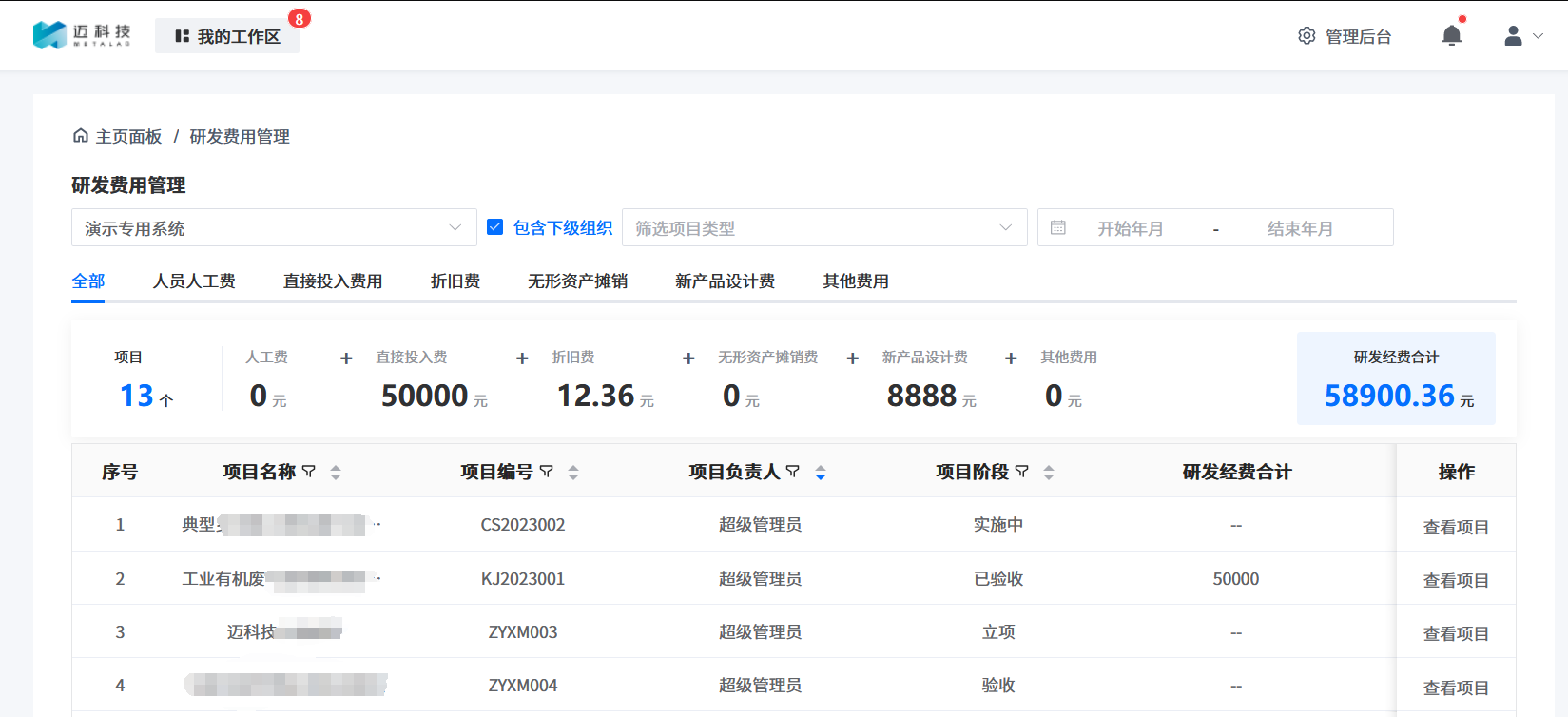 对此,迈科技通过企业科创管理数字化系统“司南”,按照研发活动形式归集研发项目费用,自动归集统计形成人员人工费、直接投入费用、折旧费、无形资产摊销、新产品设计费、其他费用六大类研发费用,支持报表材料一键导出,帮助企业判定研发项目性质、关注研发支出真实性、留存充分资料、形成有效支出证据链来确保研发费用归集的合理、合规。