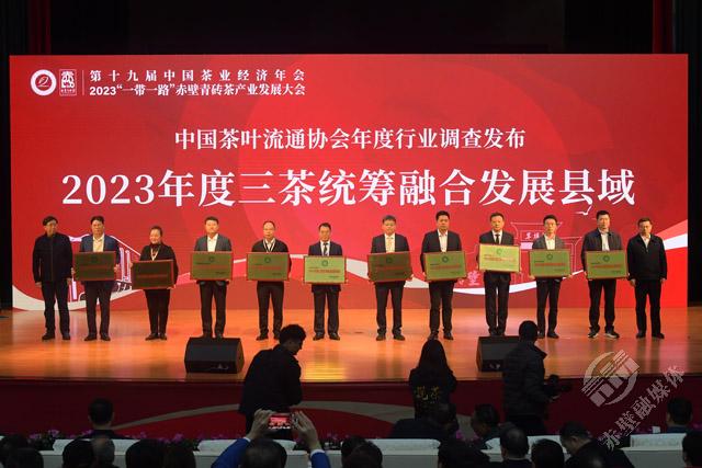开幕大会上,中国茶叶流通协会发布了“2023年度茶业重点县域调查结果”,湖北赤壁市等10个县市获授“2023年度三茶统筹融合发展县域”称号,苏州市吴中区等10个县市区获授“2023年度茶业乡村振兴发展县域”称号。