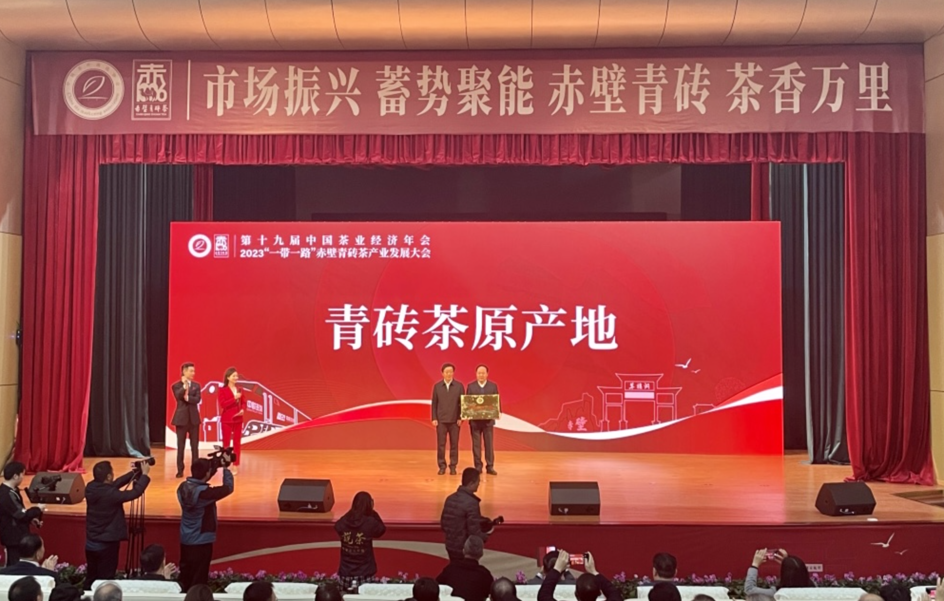 云上咸宁报道(记者 罗世喜 李瑞丰 赤壁台)11月18日上午,第十九届中国茶业经济年会、2023“一带一路”赤壁青砖茶产业发展大会在赤壁市开幕。开幕式现场,中国茶叶流通协会授予赤壁市“青砖茶原产地”称号。