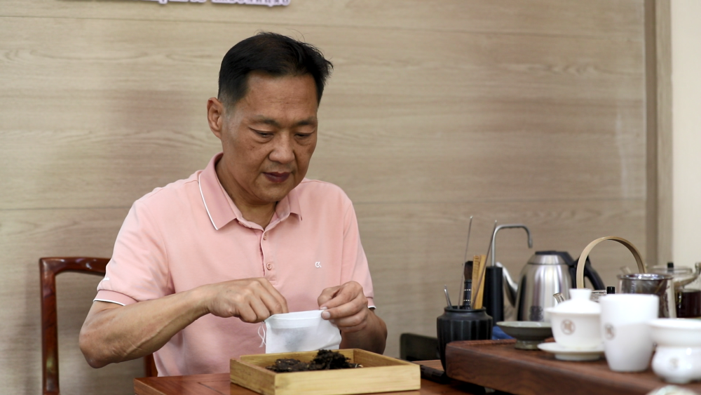 非遗传承人权威在完成青砖茶冲泡前的准备工作。新华社记者 潘志伟 摄