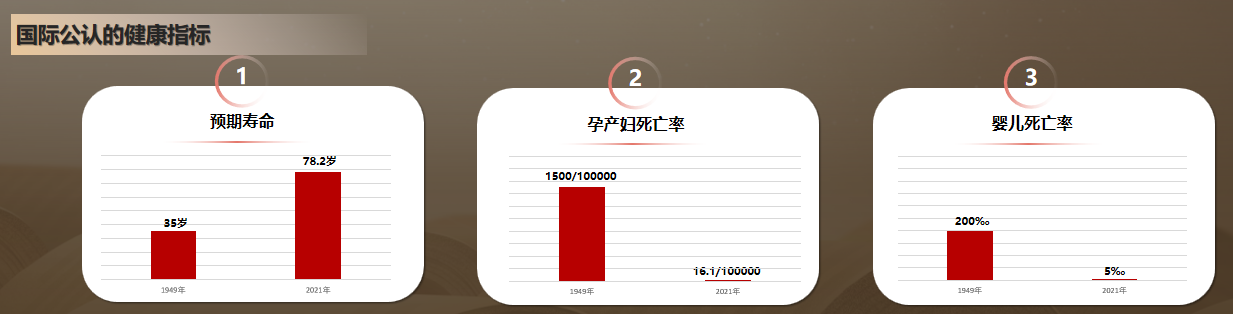 詹启敏院士介绍了70余年来我国卫生事业发展的显著成就。他指出,从世界卫生组织用来衡量各个国家健康水平的三项公认指标来看,我国平均预期寿命从1949年的35岁增至2021年的78.2岁,孕产妇死亡率从10万分之1500降至10万分之16.1,婴儿死亡率从千分之200降到千分之5。