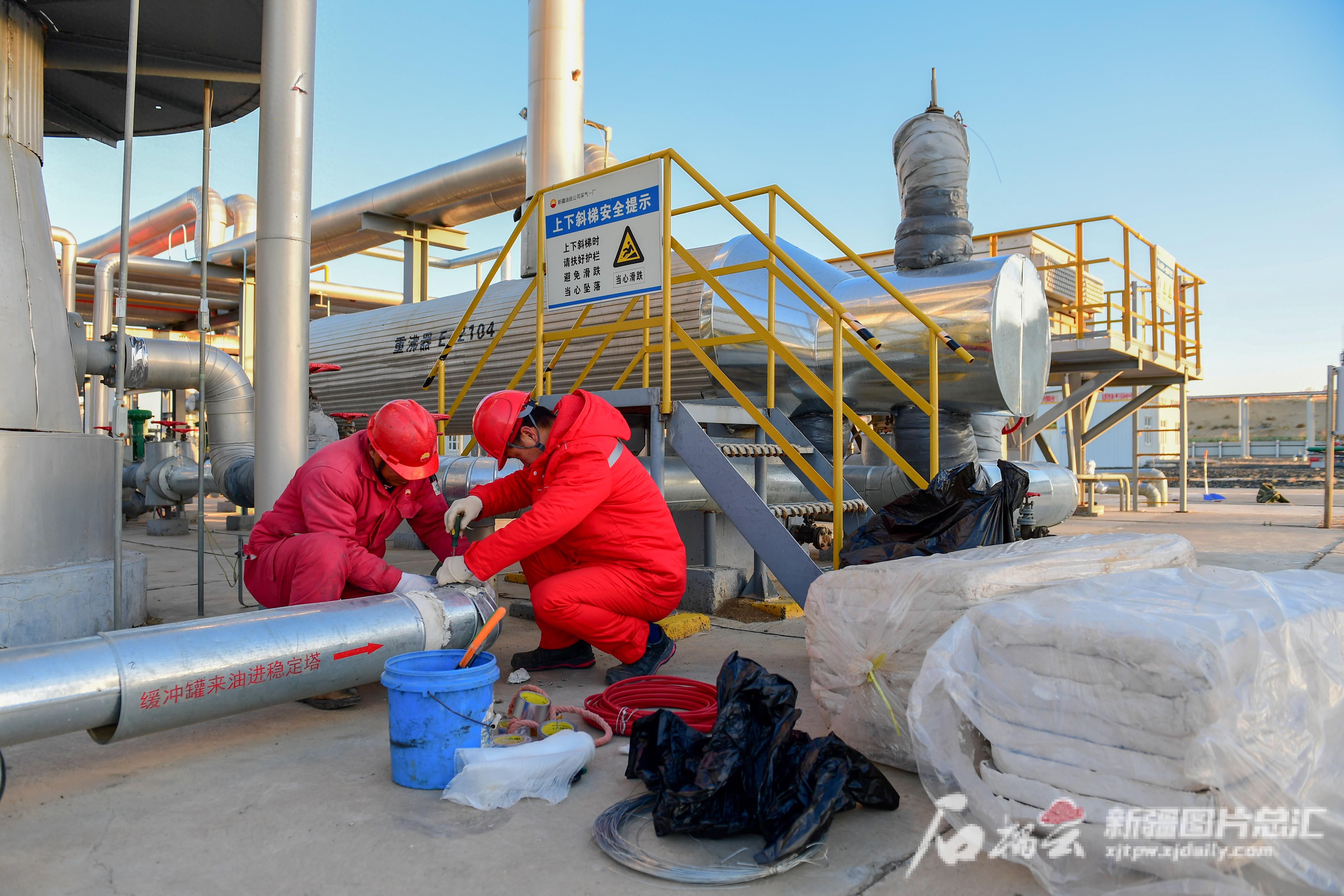 11月18日,在克拉美丽气田天然气处理站,员工正在指导施工单位工人给输气管线加装保温棉。蒋剑 摄