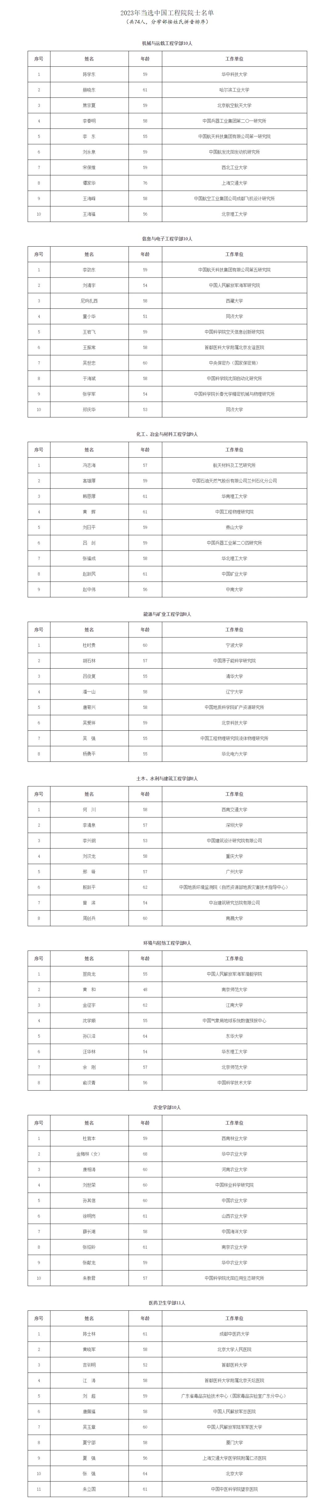 2023年共选举产生中国工程院院士74人,院士队伍的学科分布和年龄结构进一步优化。