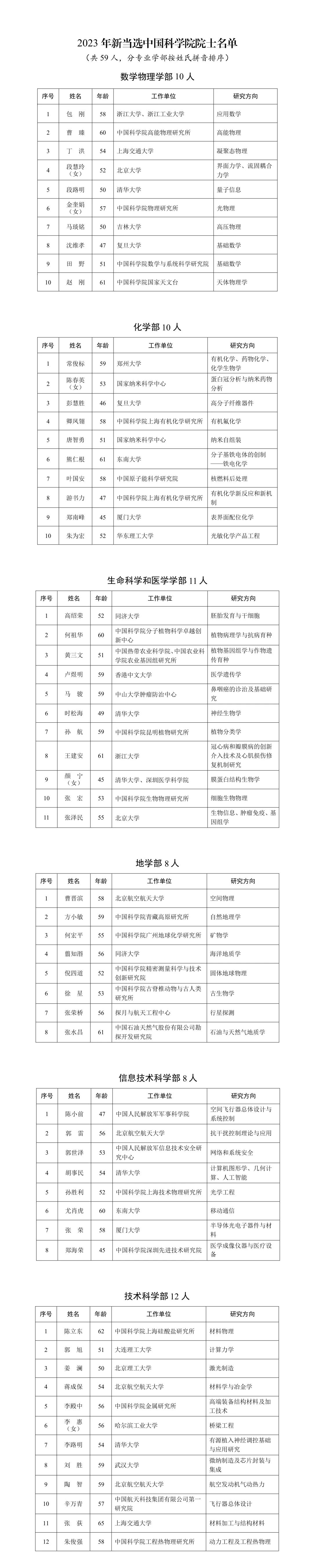 其中,数学物理学部10人,化学部10人,生命科学和医学学部11人,地学部8人,信息技术科学部8人,技术科学部12人。新当选院士平均年龄54.7岁,最小年龄45岁,最大年龄65岁,60岁(含)以下的占90%。女性科学家有5人当选。院士队伍的学科分布和年龄结构进一步优化。本次增选后,现有中国科学院院士共873人。