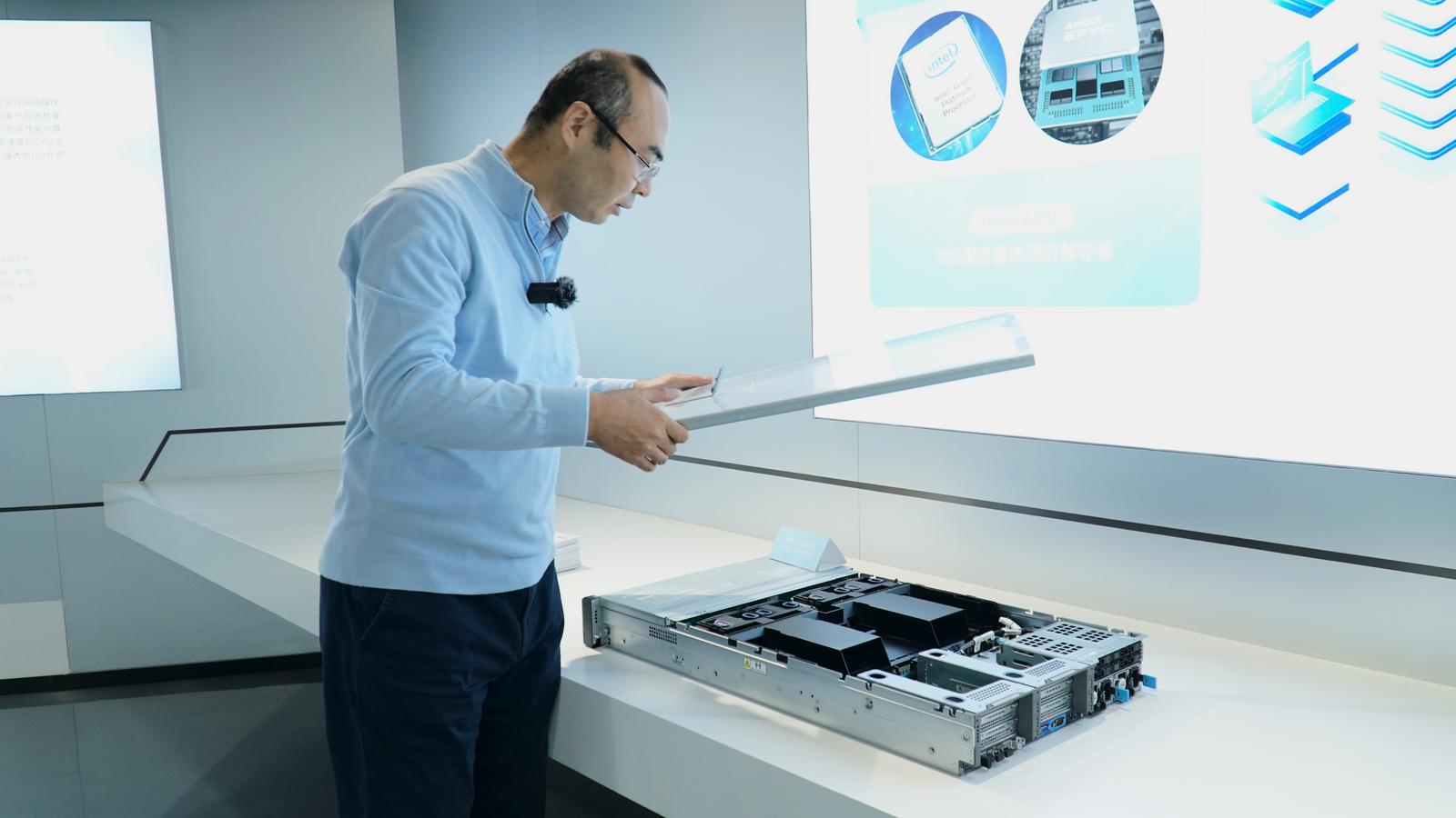 同泰怡信息技术(宁夏)有限公司总经理李麟在讲解服务器。