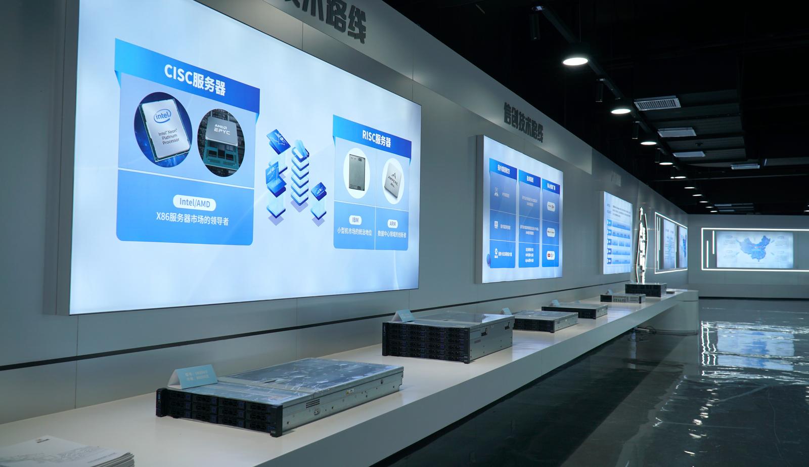 在同泰怡信息技术(宁夏)有限公司一楼展厅,一排银色类似电脑主机大小的人工智能服务器陈列在展台。