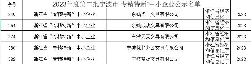 11月21日,宁波市经济和信息化局2023年度第二批宁波市“专精特新”中小企业结束公示,宁波文具行业协会共有五家企业入选,分别是副理事长单位宁波华丰文具有限公司、宁波天天文具有限公司,监事单位宁波赞扬文具有限公司,会员单位宁波优和办公文具有限公司、余姚市成功文具制造有限公司,宁波文具行业“专精特新”阵营再扩容。