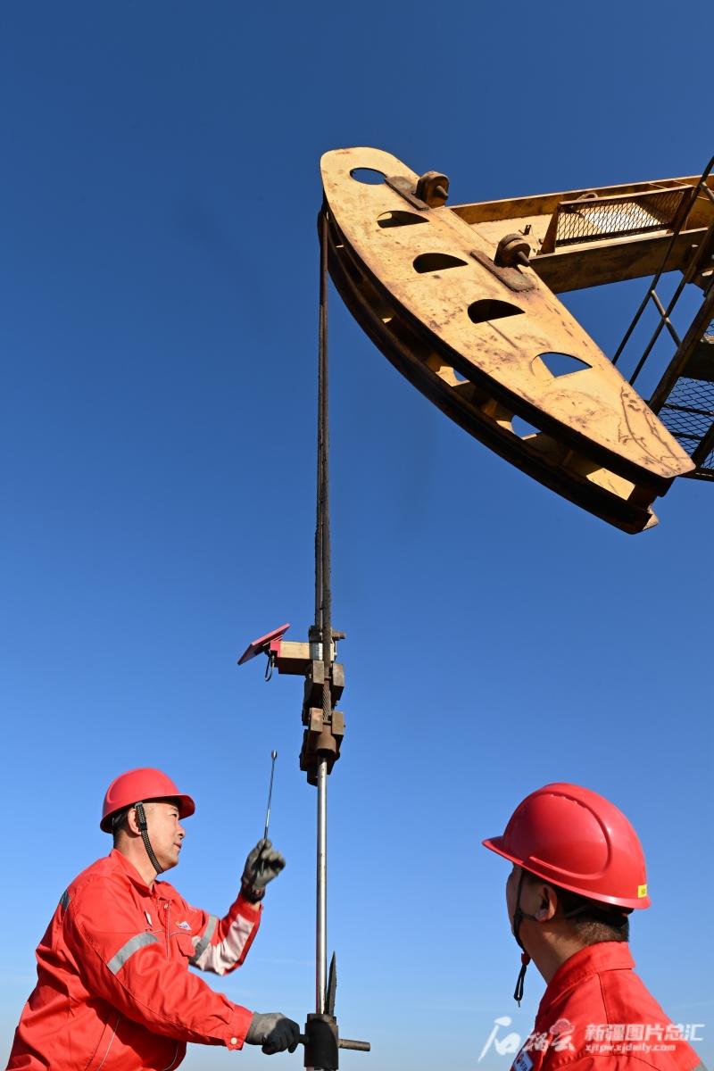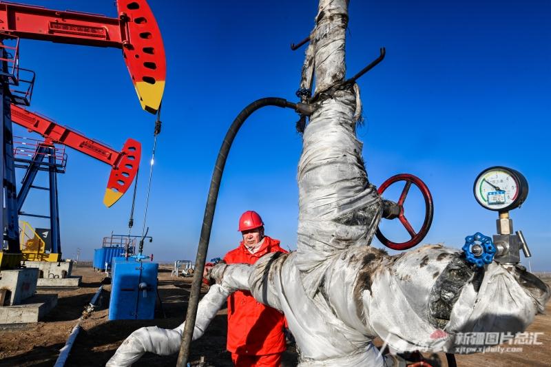 11月26日,工人在中国石油新疆油田公司准东采油厂火烧山作业区巡检。