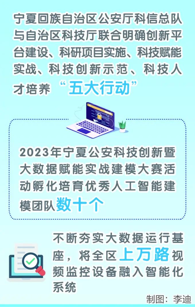 近期,宁夏公安机关扎实推进科技兴警三年行动计划,紧扣“奋力推进宁夏公安工作现代化”这一主线,大力加强智慧公安建设,沿着技术发展方向,突出科技创新、重点建设、赋能实战、管理运营,把人工智能、大数据融入打防管控建各项工作,全面助推公安工作质量变革、效率变革、动力变革。“如今,人工智能建设应用新动能为公安工作现代化强基赋能,成为提升全警能力的重要抓手,助力提升警务工作成效。”自治区公安厅相关负责人表示。