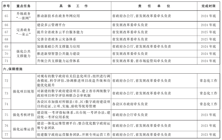 1.基础设施。建设高速泛在、承载充足、技术领先的全省政务“一张网”,全面强化网络基础设施集约化支撑能力。完善全省政务“一朵云”,为数字政府应用提供安全、稳定、可靠的云计算资源。