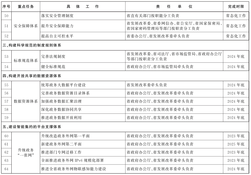 4.标准规范。按照国家标准规范体系,进一步完善我省数字政府地方标准规范,包括总体标准以及管理标准、基础设施标准、数据标准、公共支撑标准、应用标准和安全标准等分领域标准。