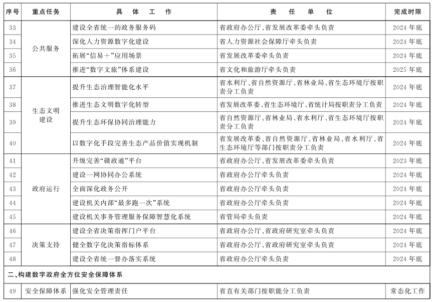 围绕江西省数字政府建设总体架构,明确全省数字政府建设主要任务,构建政府数字化履职能力、安全保障、制度规则、数据资源、平台支撑的数字政府体系,推动数字政府建设有序开展。