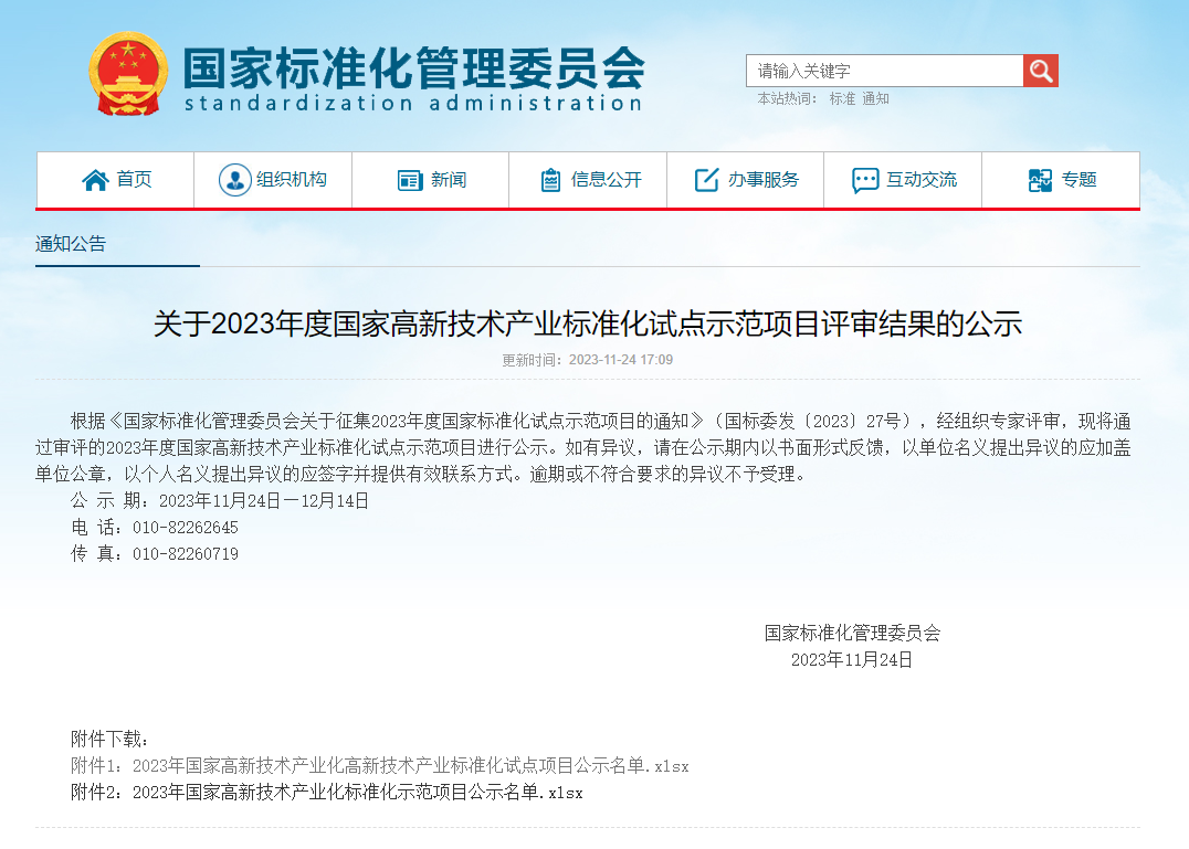 近日,国家标准化管理委员会公示了国家高新技术产业标准化示范项目名单。