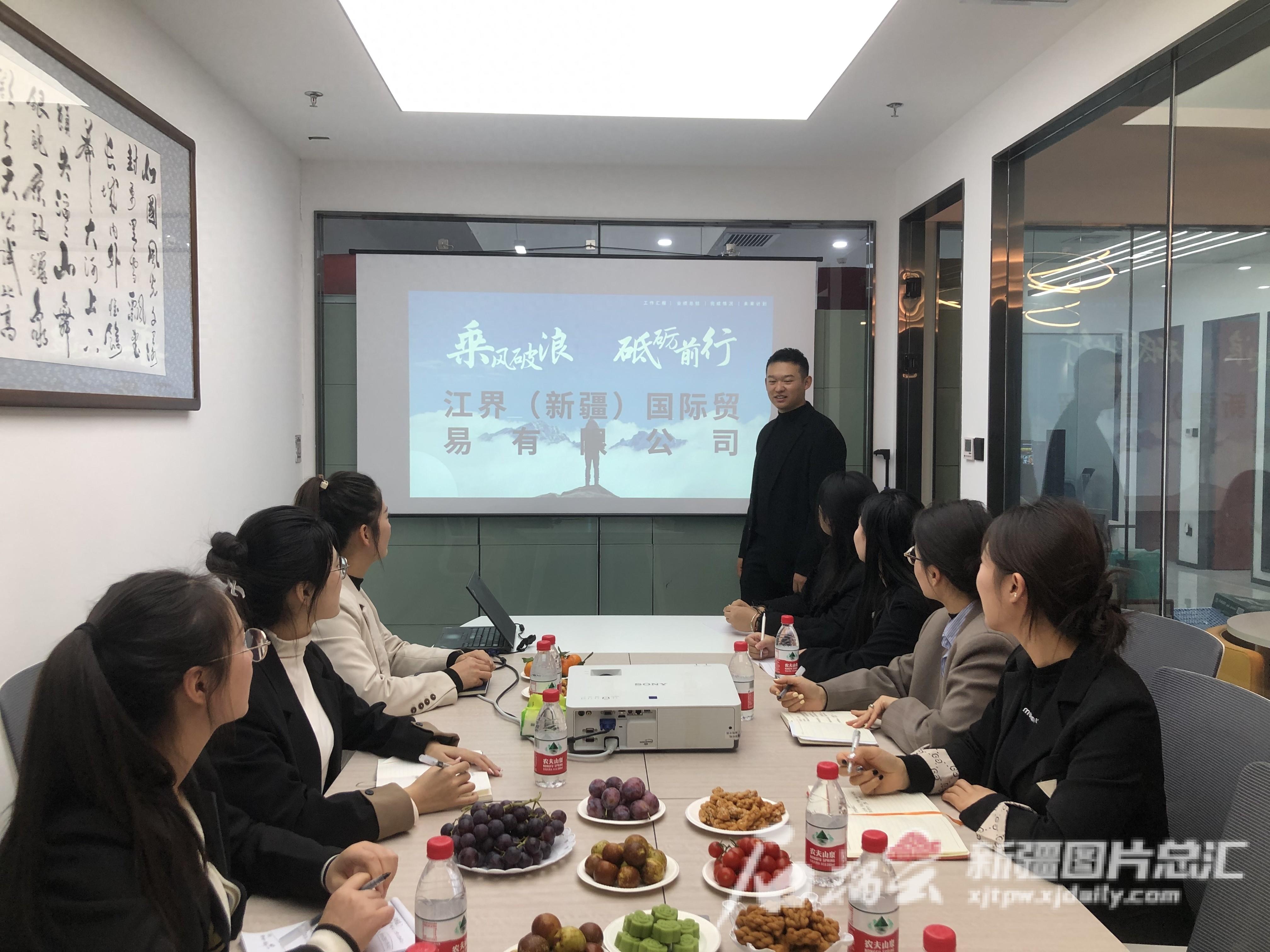 11月29日,江界(新疆)国际贸易有限公司总经理杨勇琦正在公司会议室和员工畅谈公司今后业务发展规划。石榴云/新疆日报记者 索蓉芝摄