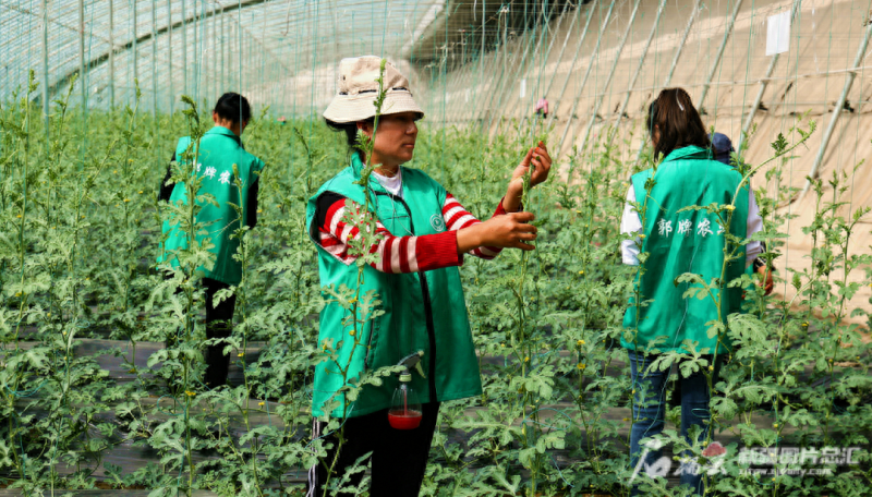 在疏勒县郭牌农业产业园日光温室大棚里,布哈力齐·斯迪克正在给村民教西甜瓜吊蔓技术,2022年大学毕业的她回到家乡,在该农业产业园的种植培训基地从业学习一年,已成长为一名优秀的农业技术员。
