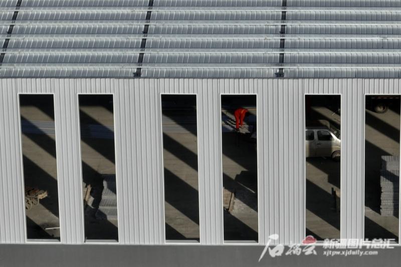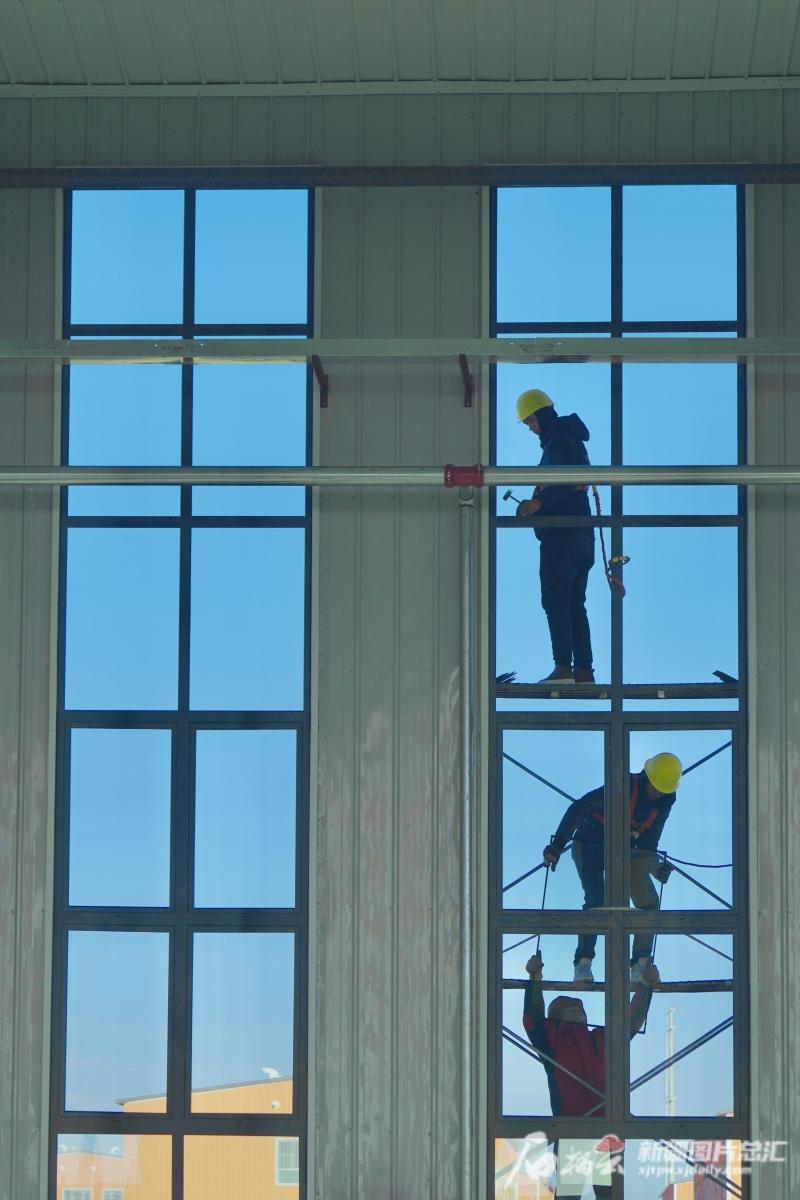12月5日,施工人员正在安装最后一栋服务用房的窗玻璃。